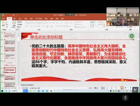 研究生第三党支部书记黄泽全说:“在严峻的疫情防控形势之下,新葡京娱乐城App 学生党员在线上线下与李书记今天一起学习了党的二十大报告,李书记表达了对学生们的亲切关怀,疫情当下党员的责任和义务,随后结合党的二十大报告,以‘扛起新时代共产党人的历史担当’为主题,分享了党的二十大学习的感悟和精神。其中提到,党的二十大报告是党和人民的集体智慧,是我们党一段时间的首要政治任务。听取过程中,李书记从自身经历和社会变化,多角度分析和讲述了我们国家的深刻变化,也让我们颇受感触。青年大学生应该立志做有理想、敢担当、能吃苦、肯奋斗的新时代好青年。”