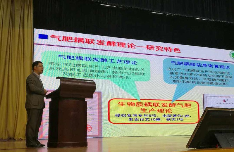 党委书记李世欣、副院长胡建军教授、生物质能源河南省协同创新中心的部分老师以及10余名研究生参加了本次会议。副院长胡建军教授在大会上作了题为“生物质耦联发酵生产沼气沼肥及其深度利用技术研究”的特邀报告,从气肥耦联生产理论及工艺研究、气肥耦联生产成套装备开发、气肥耦联应用模式构建及推广、沼气发电及余热梯级利用技术等方面进行了详细生动的讲解。报告引起了与会代表的广泛共识与热烈讨论,得到了会议举办方的高度赞赏。研究生张甜的论文“接种量对产气肠杆菌同步糖化暗发酵产氢的影响”荣获优秀论文三等奖。