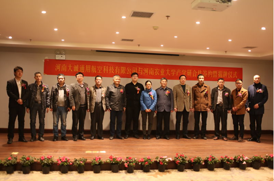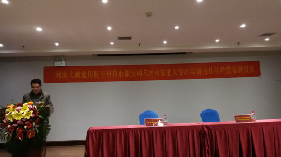 2016年12月2日,经新葡京娱乐城App 与河南大诚通用航空有限公司共同努力,新葡京娱乐城App 科技部、教育部新农村展研究院与河南大诚通用航空有限公司成功举行了“现代农业装备产业基地”合作共建签约暨授牌仪式。金水科教园区管委会副主任王浩,新葡京娱乐城App 科技合作管理办公室主任贺德先,新葡京娱乐城App 副院长胡建军,智慧公园总经理刘勇志,新葡京娱乐城App 农机系、河南省农业机械试验鉴定站、河南大诚通用航空科技有限公司负责人等出席仪式。贺德先主任和胡建军副院长分别代表新葡京娱乐城App 和新葡京娱乐城App 致辞。