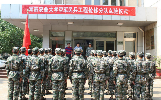 于15号楼前举行空军民兵工程抢修分队点验大会。金水区武装部政委李继东、校学生工作部部长、武装部部长李书民、我党委副书记刘海涛出席了此次仪式,新葡京娱乐城App