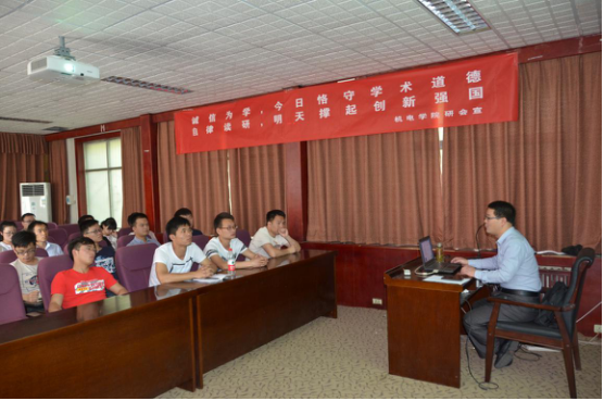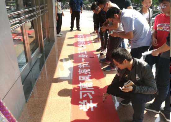 研究生宣讲学术道德与学风建设文件精神,号召研究生在“高风亮节,一身正气,争做廉洁先锋”条幅上郑重签名,坚定“守规矩,倡廉洁,扬正气”的决心。