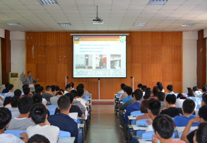 Animesh Dutta教授从环境问题切入,阐述了清洁能源生产的重要性,强调了以生物质为原料进行清洁可再生能源生产的可行性和必要性,以图文并茂的方式介绍了圭尔夫大学关于生物质能源领域的发展动向和研究进展,并与师生进行了互动交流。
