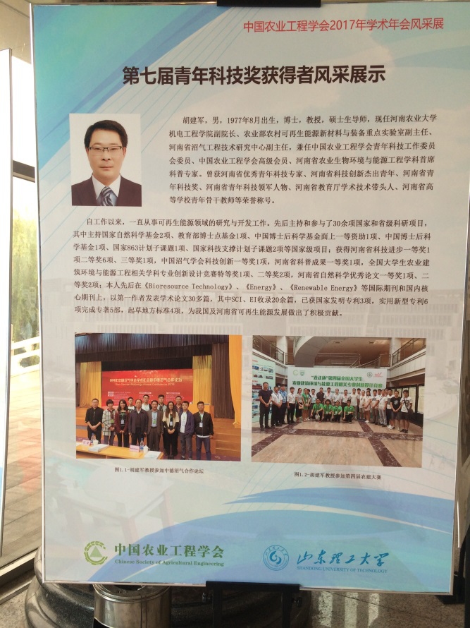 副校长张全国、新葡京娱乐城App 党委书记李世欣、院长徐广印、副院长胡建军以及新葡京娱乐城App 部分师生共计50余人参加了此次会议。胡建军教授获得中国农业工程学会第七届青年科技奖。博士研究生李亚猛、朱晨辉、杨立权,硕士研究生刘会亮、李冲分别作了分会场报告,其中李亚猛和朱晨辉获得“中国农业工程学会2017年学术年会青年学生优秀论文奖”。