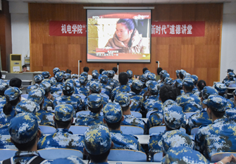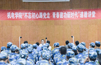 在图书馆报告厅为18级新生开展“不忘初心跟党走 青春建功新时代”道德讲堂活动,此次道德讲堂由李想主持,并邀请校第五届道德模范获得者15级学生魏国胜和校第六届道德模范获得者14级学生孙语嫣新生分享自己的故事。