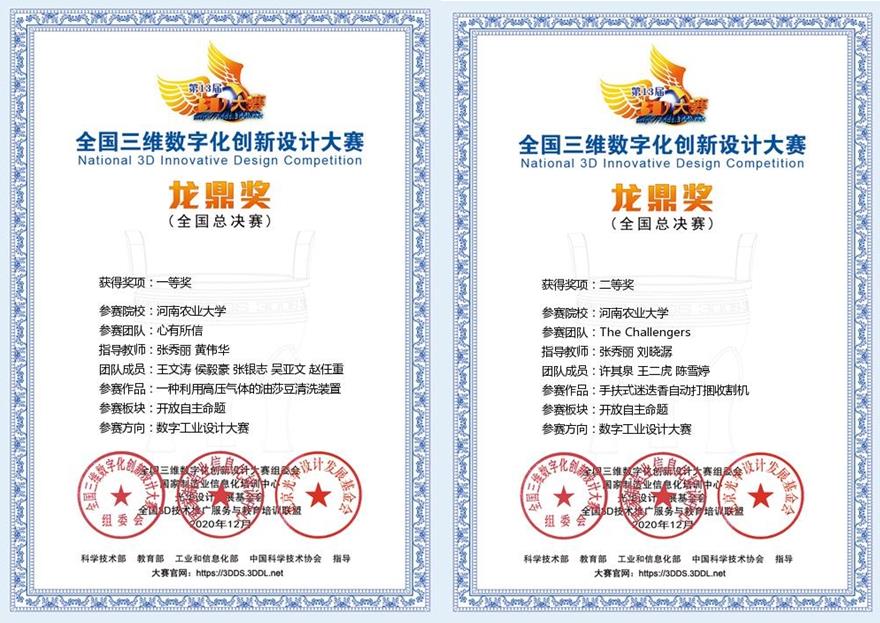 全国第13届三维数字化创新设计大赛(简称3D大赛)年度总决赛于2020年12月5日-6日成功举办。经过激烈角逐,由张秀丽教授、黄伟华老师指导的“心有所信”团队(队员:王文涛、侯毅豪、张银志、吴亚文、赵任重)凭借作品《一种利用高压气体的油莎豆清洗装置》取得大赛(数字工业方向)一等奖,由张秀丽教授、刘晓潺博士指导的“The Challengers”团队(队员:许其泉、王二虎、陈雪婷)凭借作品《手扶式迷迭香自动打捆收割机》取得大赛(数字工业方向)二等奖。