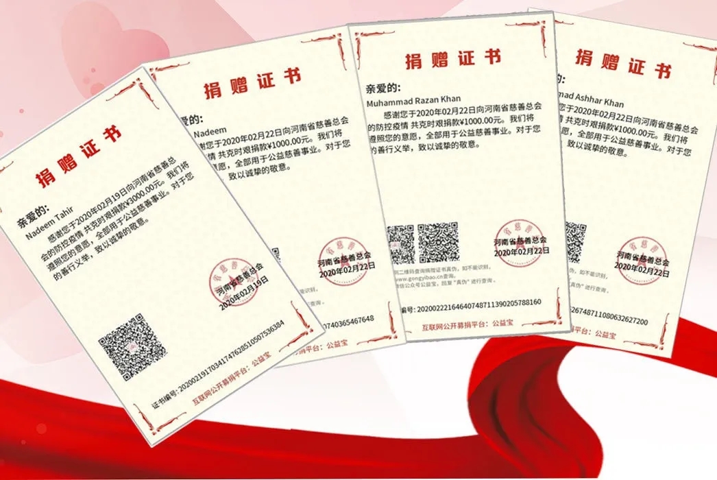 抗“疫”战争的进展时刻牵动着塔希尔教授一家人的心。2月19日,塔希尔教授向河南省慈善总会捐款3000元人民币,并在落款中写到:我们永远和你们在一起,我们相信中国政府,相信中国人民,期待春暖花开。2月22日,塔希尔教授以妻子和两个儿子的名义再次向河南省慈善总会捐款3000元。他说,他和家人都想为抗击疫情出一份力,但目前能做的只有尽己所能捐助一点钱,以此表达万众一心、共克时艰的心情。他还表示,自己所从事的是生物质能源和纳米材料相关领域的研究,如果自己是医生的话,也会奋不顾身冲上前线。(文/张志萍)