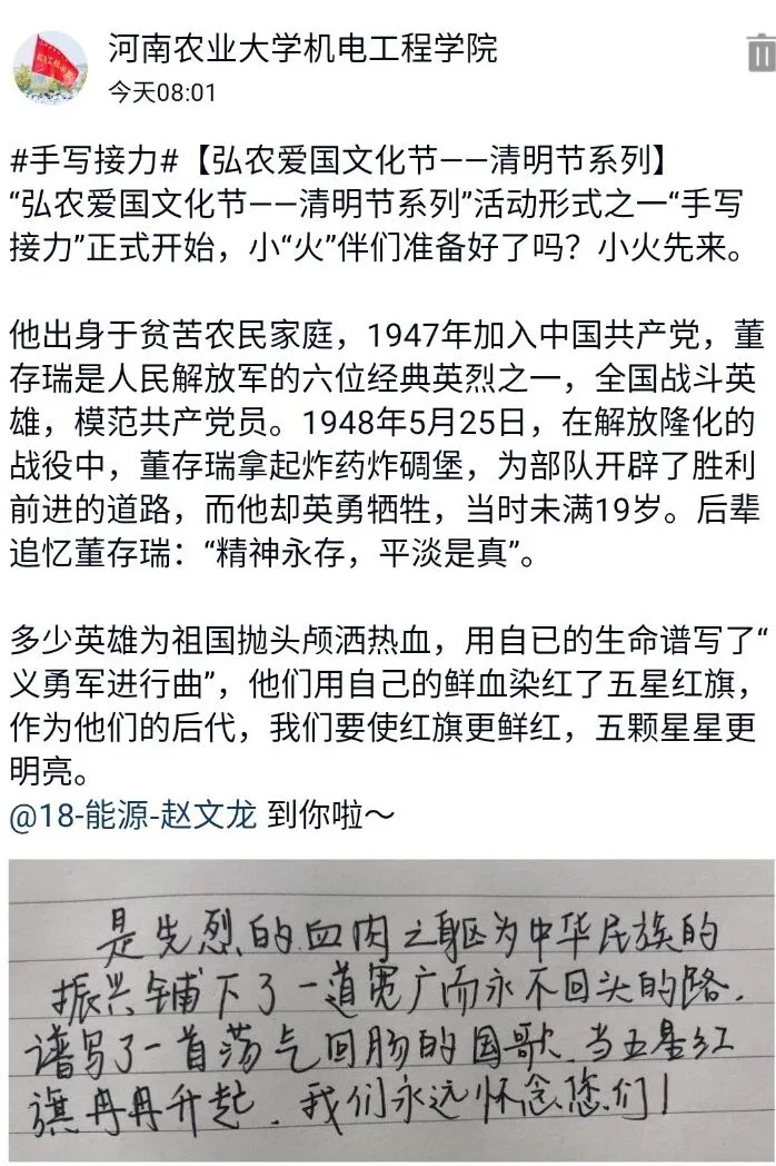 新葡京娱乐城App 高度重视此次“弘农爱国文化节”活动,广泛宣传,积极组织师生参与。活动开展形式众多,线上利用官方微信、微博、QQ等平台,开设主要烈士陵园介绍、革命故事讲述、网络祭祀、学生作品展示等专栏,共推送专题微信七期,讲述英烈生平,解读英烈感人故事,带领师生走近他们,读懂他们。官方QQ发起“线上接力——执笔书写豪情,缅怀英雄烈士”活动,通过手写一段赞美革命先烈的语句并接力的方式来追思英雄,在学生中引起积极反响。线下动员班级,召开“缅怀英烈,铭记历史”主题班会,通过腾讯会议、QQ电话等方式发起线上交流会,组织支部学生集中学习,积极讨论,营造追忆历史、致敬英烈、传承精神的良好氛围。此外,工作室面向全院学生征集诵读红色家书、讲述革命故事、致敬英烈书画、诗歌等相关作品,并及时在微信专栏进行推送展示。在新葡京娱乐城App 内形成了致敬英烈,缅怀英雄的精神导向,进一步加强学生对革命精神和爱国情怀的体会。