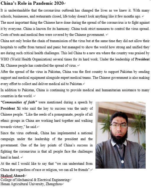 Shakeel Ahmed也撰写了一篇长文,他深情的说到中华民族是一个坚强而又团结的民族,在习总书记的领导下,中国多次受到世界卫生组织赞扬,中国人民控制了病毒的传播。在病毒蔓延到巴基斯坦时,中国也是第一个向巴基斯坦提供专家医疗队和医疗设备的国家,充分体现了中国为构建命运共同体作出的贡献。