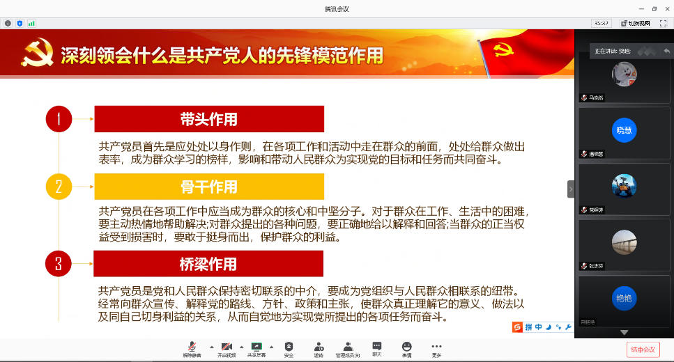 胡院长首先结合当前国内国际“疫情”局势,向大家强调了习近平总书记的重要指示,各级党组织和广大党员干部必须牢记人民利益高于一切,不忘初心、牢记使命,团结带领广大人民群众坚决贯彻落实党中央决策部署,全面贯彻坚定信心、同舟共济、科学防治、精准施策的要求。接着又针对深刻领会什么是共产党人的先锋模范作用,战“疫”一线对党员先锋模范作用的要求,和战“疫”一线如何发挥党员先锋模范作用展开讲述。他提到党员的先锋模范作用体现在带头作用、骨干作用和桥梁作用;针对当前的战“疫”形式,对每个党员的先锋模范作用的要求包括:政治合格是根本要求,执行纪律合格是基本底线,品德合格是关键导向,而发挥作用合格是核心要素。最后,胡院长强调“一个党员就是一面旗帜,一个支部就是一座堡垒”,在战“疫”一线,党员同志一要讲政治,争当疫情防控的急先锋;二要讲担当,争当疫情防控的引导员;三要讲奉献,争当疫情防控的排头兵;四要讲纪律,争当疫情防控的保护者。