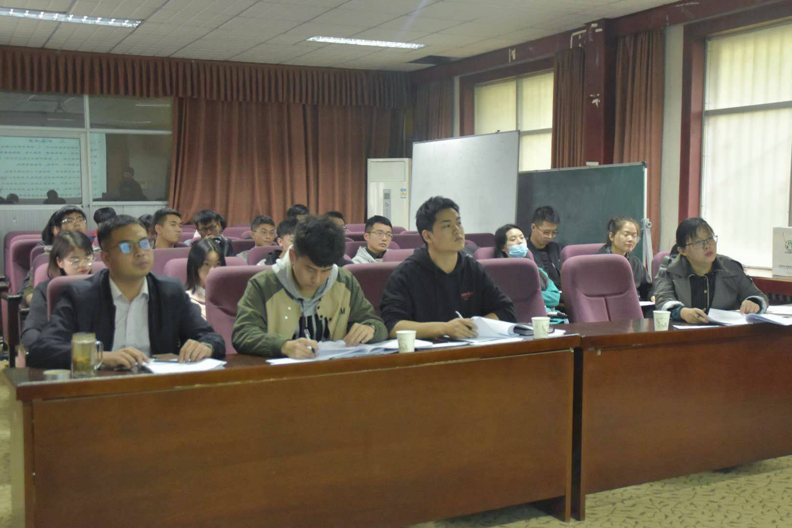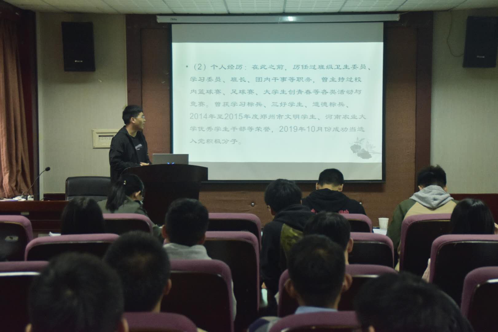 报告厅举办“大学生职业生涯规划大赛”决赛。院团委副书记宋东皓、团委老师徐捧丽、院兼职辅导员张鹏飞、赵志强担任此次决赛评委,19级能源一班杨鑫担任主持。