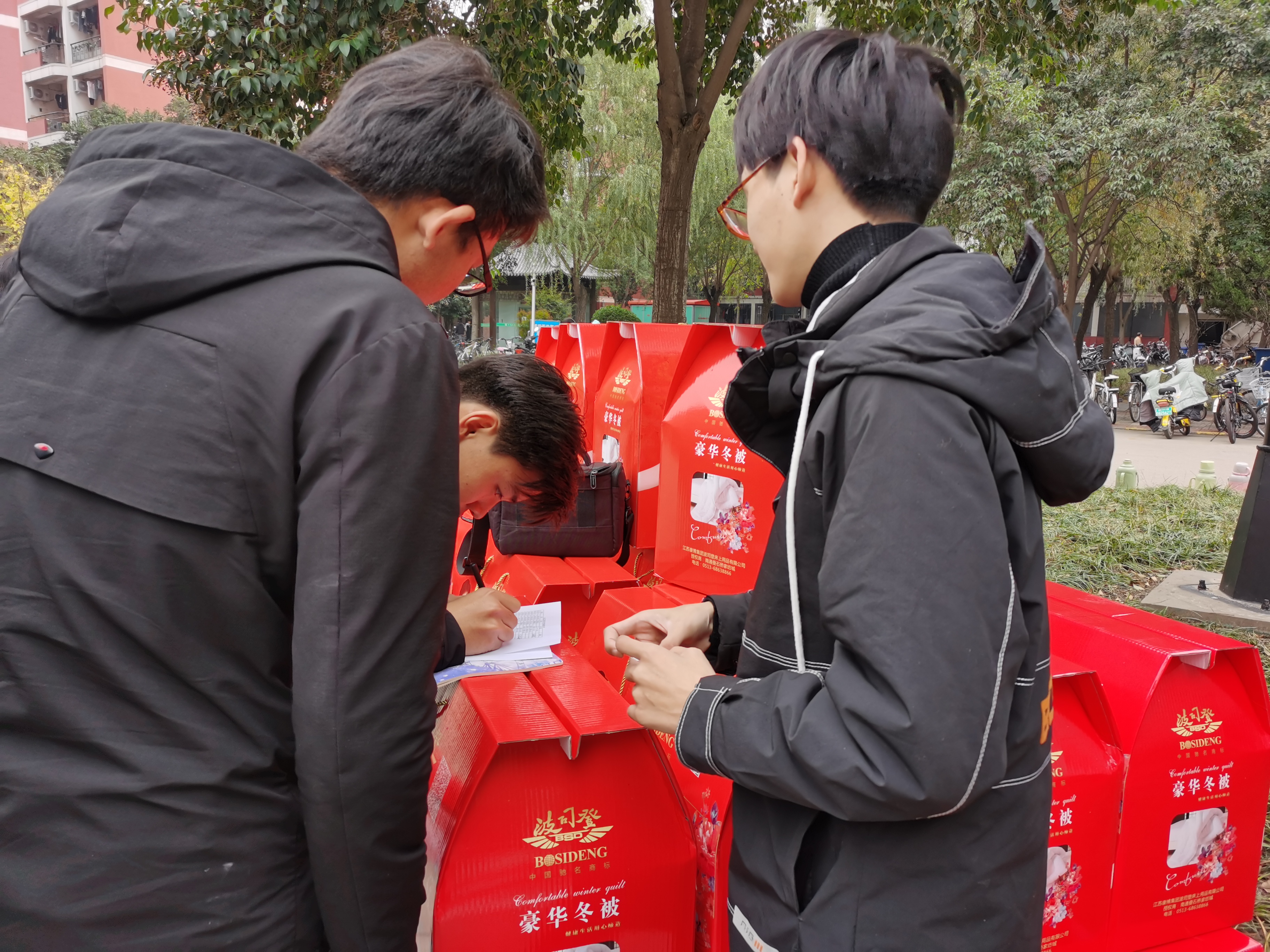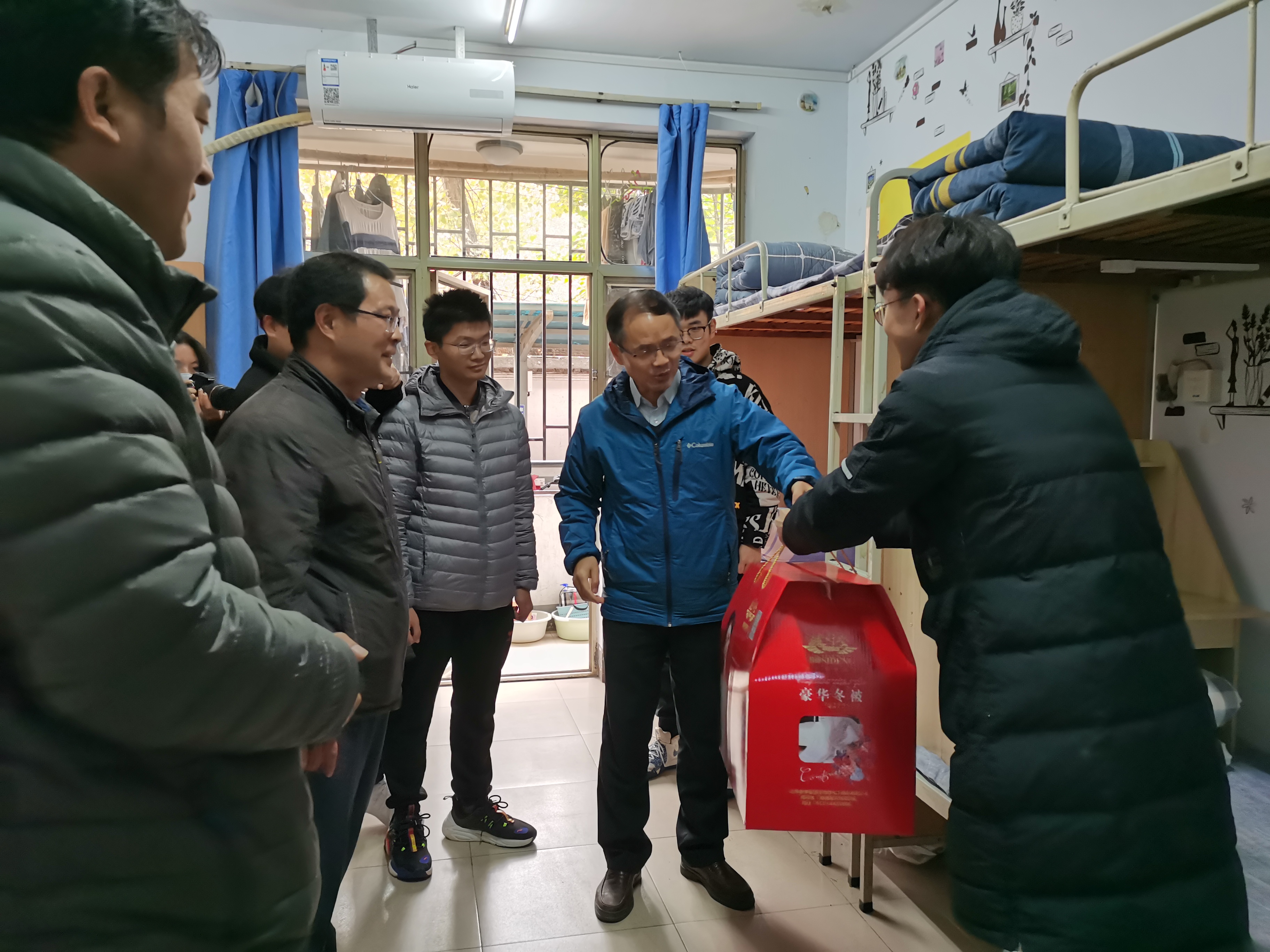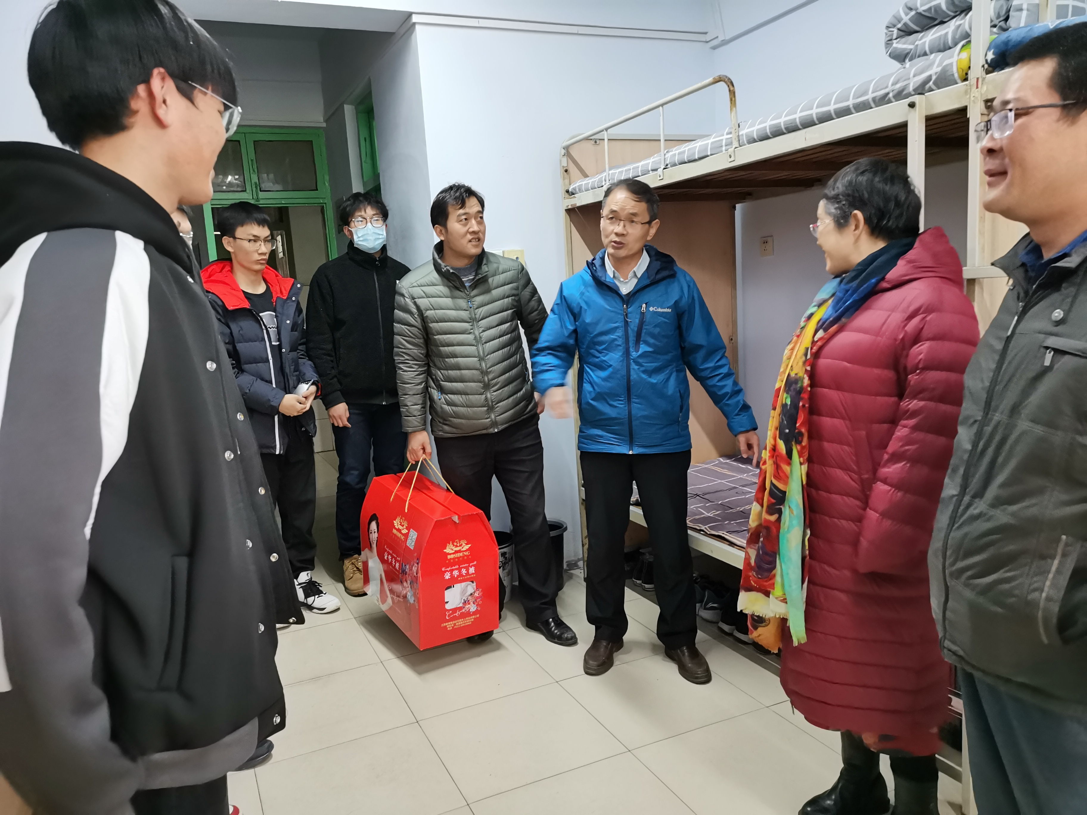 学生,了解大家的思想、学习及生活状况,并为衣被单薄的学生送去御寒保暖的棉被。
