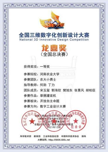 何勋、丁力老师指导的“农大小勇士”团队(研究生队员:宋玉玺、郭海钦、樊旭东、张景风、胡柏臣)凭借作品《草捆灌装机》取得大赛(数字工业方向)一等奖,由新葡京娱乐城App