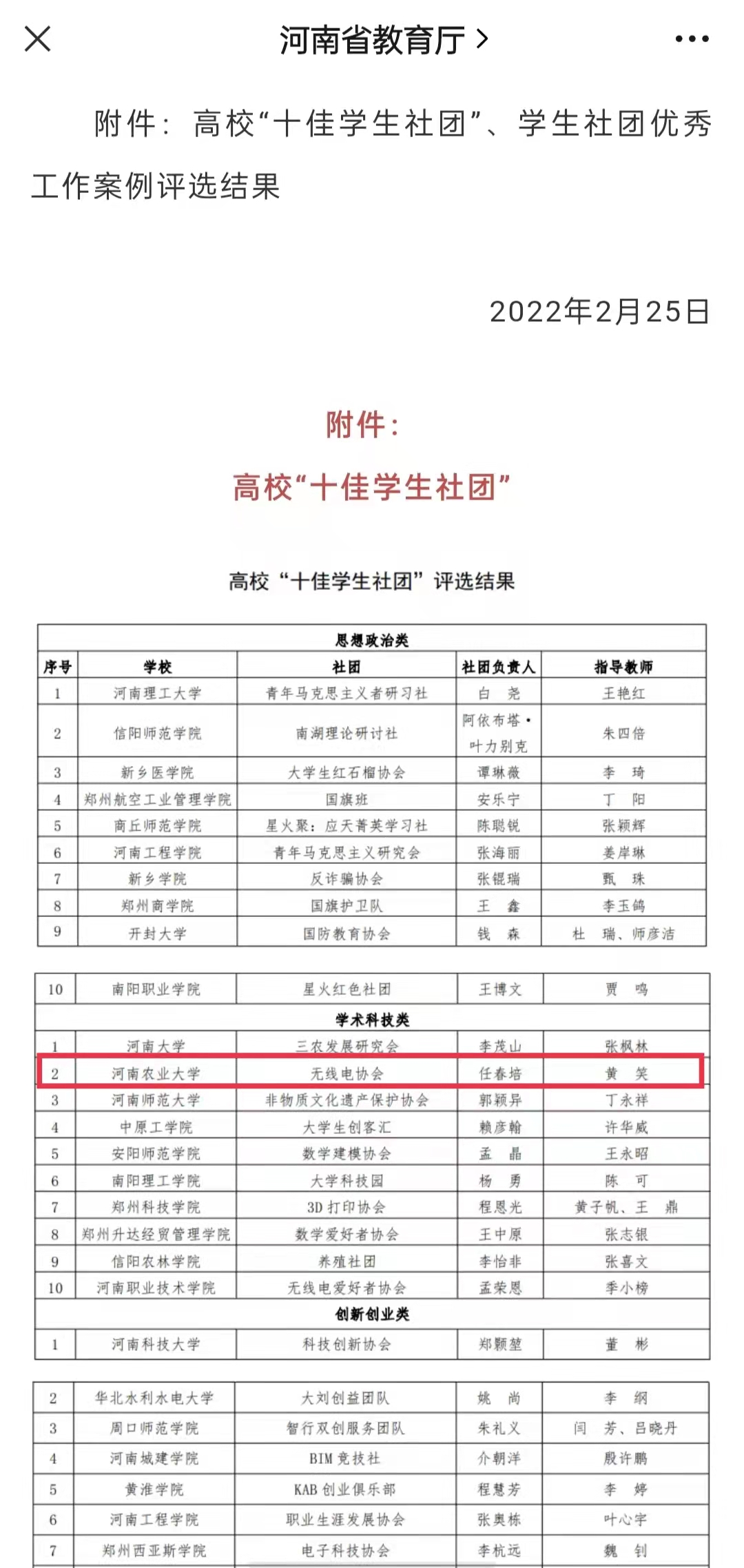 喜报!新葡京娱乐城App 无线电协会荣获全省高校“十佳学生社团”荣誉称号