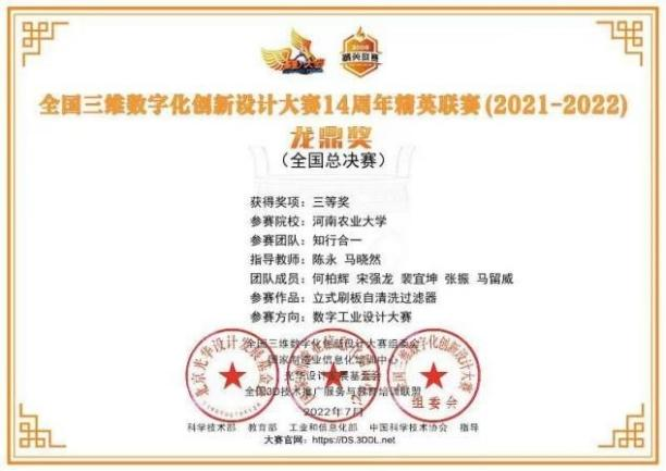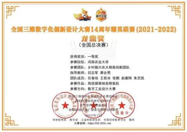 师生获省特等奖3项的好成绩。由吕志军、黄会男老师指导,任春培、王若冰、赵豪刚、张鹏、朱艺凯本科生组建的“乡村振兴农大移栽创新团队”凭借《高效烟草钵苗移栽机》作品取得省赛特等奖,由陈永、马晓然老师指导,何柏辉、宋强龙、裴宜坤、张振、马留威研究生组建的“知行合一团队”凭借《立式刷板自清洗过滤器》作品取得省赛特等奖,由李赫、杨自尚老师指导,刘家威、郭长乐、柴嘉君、史云辉、李昱岐研究生组建的“冠亚组团队”凭借《玉米大豆带状复合种植分带喷杆喷雾剂》作品取得省赛特等奖。