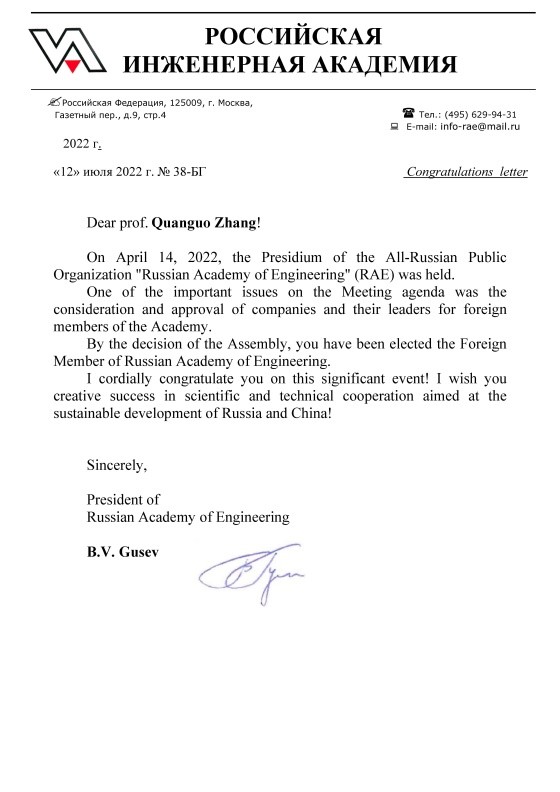 张全国教授当选俄罗斯工程院外籍院士