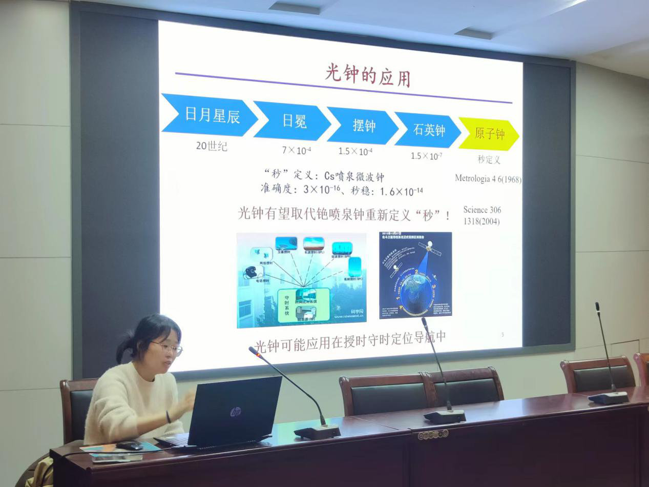 商俊娟 以“争分夺秒 再创佳绩”为题为与会研究生开展学术讲座。首先,商俊娟先介绍了自己的教育经历。接下来,商俊娟从研究背景、研究内容和研究经验三个方面讲述了光钟应用的相关问题。然后商俊娟分享了研究经验:一、多阅读文献,多跑实验室;二、勤奋;三、要主动发现其问题,主动去解决问题。会议最后,商俊娟和同学们交流了在硕博期间的经验。此次讲座商俊娟的内容丰富、讲述颇具风趣,使同学们对科研学习有了更加明确的目的,同时也使同学们受益匪浅,对以后的科研生活也有了具体的规划。(文/图:周梦雪  审核:李锦)