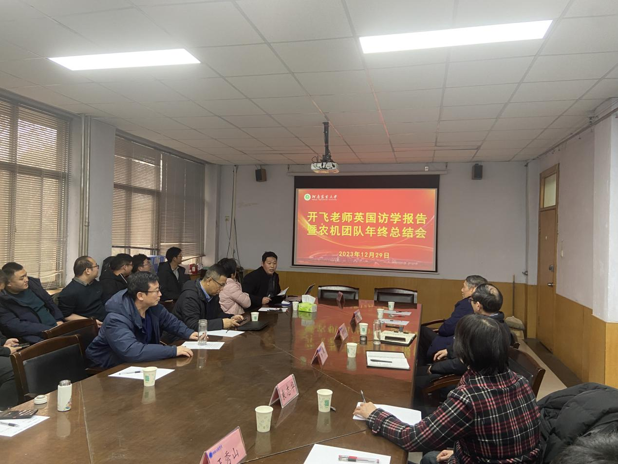 的地理位置、建筑风格、校园文化、院系设置及学生学习方式几个方面分享了在英国卡迪夫大学期间的收获和体会,并对院学生培养工作提出了一些建议和方法。王万章教授对农机团队2023年科研项目申报、发表论文/专利、奖励/比赛、科技成果转化及产业化、承担项目研究进展等情况进行了总结,并找出了学科方向的差距和努力方向。农机系支部书记李赫教授围绕党支部建设、“三会一课”、凝练支部特色、支撑学科建设与发展情况、存在的问题及改进措施等方面进行了汇报,并表明了农机支部参会的努力争创全国样板党支部的决心。随后,农机团队每名成员进行了2023年度个人工作总结汇报。会议上,院党委宋晶副书记、院团委黄笑书记及袁志华教授针对支部建设、学科方向凝练等方面与农机团队成员进行了热烈交流和讨论。提出了宝贵的建议。