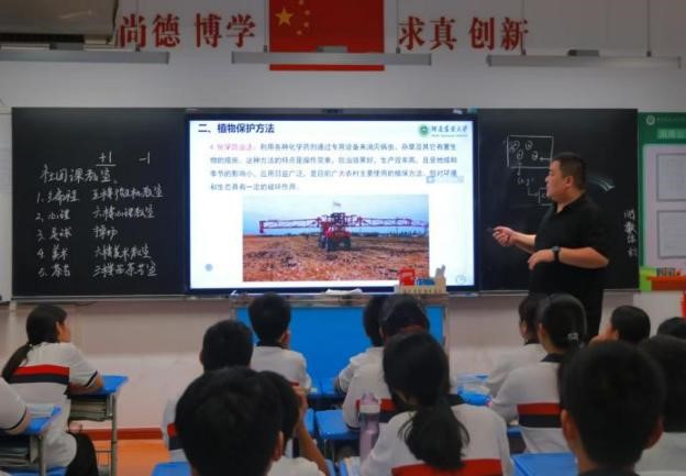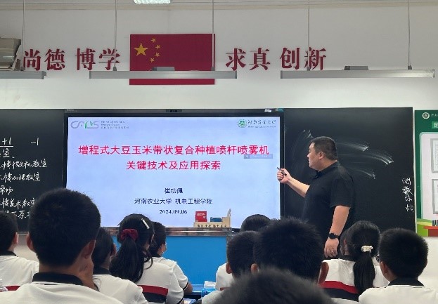 教师崔功佩博士赴附属中学开展了题为“增程式大豆玉米带状复合种植喷杆喷雾机关键技术及应用探索”的科学素养教育报告,30余名七年级学生及相关老师共同参与了本次活动。