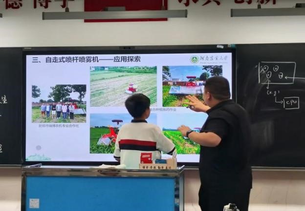 首先,崔功佩老师向同学们介绍了自己在智能农业装备领域的研究成果;其次,结合视频、动画等深入浅出地讲解了植保无人机、喷杆喷雾机等植保机械的类型和工作原理,并对喷雾系统中喷头、液压泵等关键部件的结构形式和原理进行了阐述。最后,向同学们展现了自主研发的增程式大豆玉米带状复合种植喷杆喷雾机在田间的实际应用情况,并与同学们进行了互动交流。
