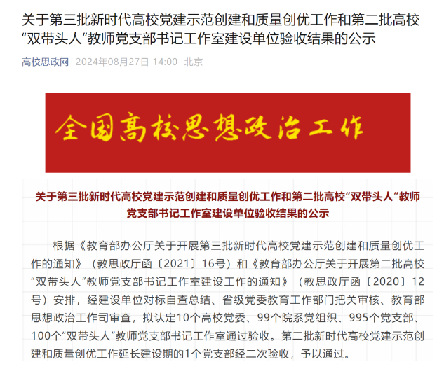 日前,教育部发布了关于第三批新时代高校党建示范创建和质量创优工作和第二批高校“双带头人”教师党支部书记工作室建设单位验收结果的公示。经过教育主管部门现场考核以及全面深入的审核等环节,新葡京娱乐城App
