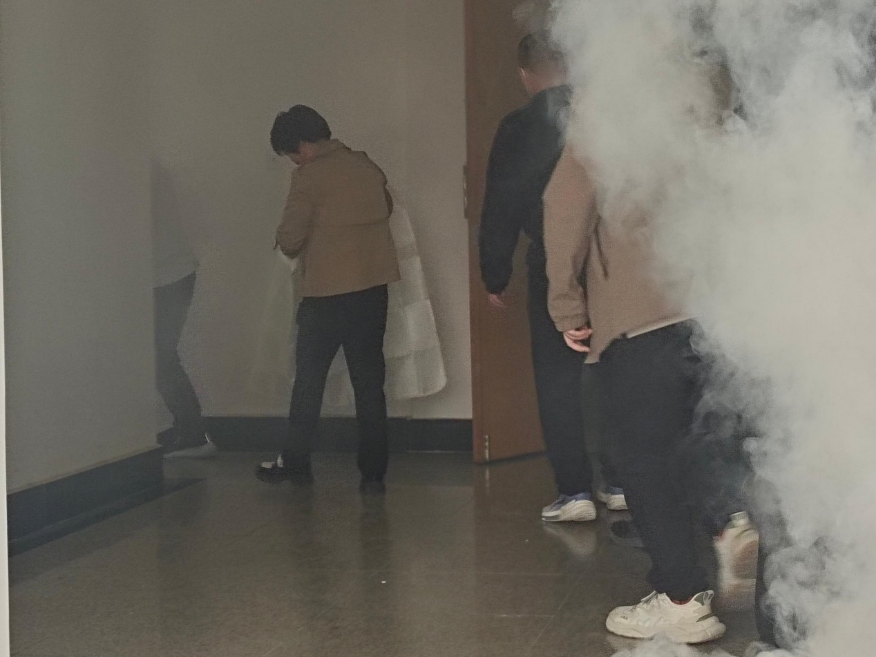 消防专员立即拉响火情警报。各楼层片区负责人迅速就位,按照预案组织师生有序撤离。全体师生或佩戴防毒面具,或用湿毛巾捂住口鼻,弯腰低姿快速通过安全通道。东西两侧师生分别从露天楼梯和中部楼梯分流撤离,整个过程紧张有序。5分钟内,全体人员安全撤离至楼前集合点。随后,各片区负责人认真清点人数,确认无人员滞留。