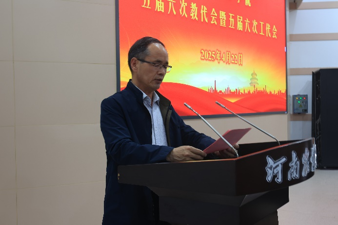 在文化路校区300人报告厅成功召开第五届教职工代表大会第六次会议暨第五届工会代表大会第六次会议。院党委书记李世欣,院长胡建军,党委副书记宋晶,副院长胡建东、刘淑杰、王振锋及教职工正式代表参加会议。