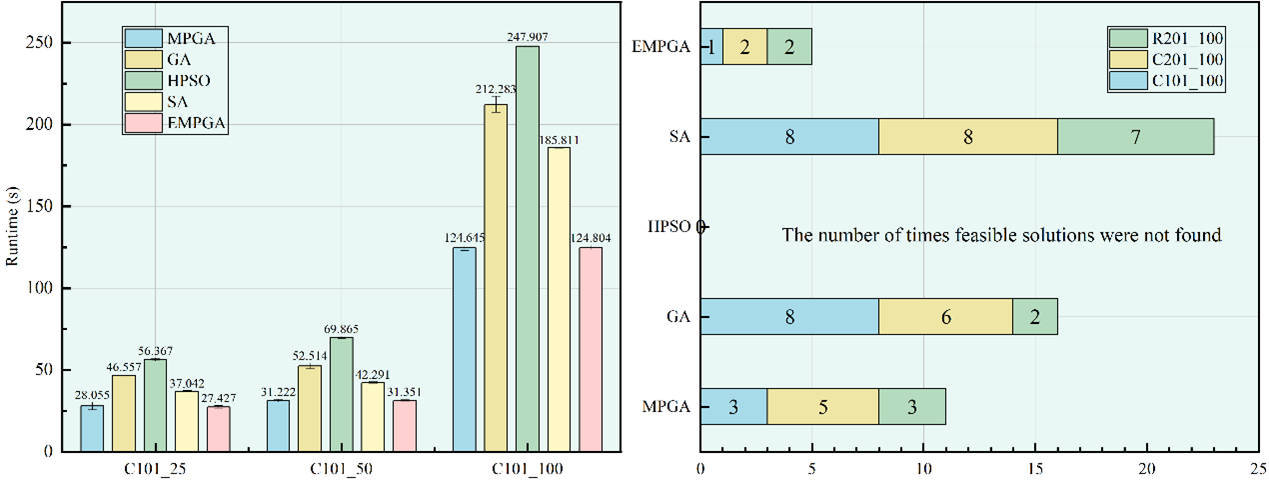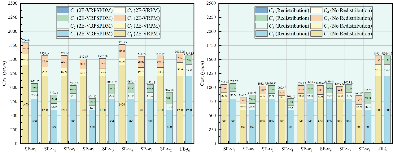 针对该模型求解复杂度高、适配数据规模大的特点,研究团队创新提出一种混合启发式算法:先通过混合模糊 C 均值聚类对门店与仓库进行智能分配,有效缩小模型求解空间;再设计改进的多种群遗传算法,结合变邻域搜索策略,实现对子问题的高效求解。该算法还创新性引入模拟退火机制优化适应度计算,同时设计自适应交叉变异与短路径消除策略,进一步提升求解结果的质量与稳定性。研究结果显示,相较于传统取送货分开操作的模式,同时取送货模式平均减少车辆调度次数 39.62%,总运输成本降低 34.66%;在支持商品灵活再分配的情况下,运输成本仅微增 0.47%,需调配商品的运输量却减少 28.72 吨。本研究提出的算法在求解质量与运行效率上均优于其他同类算法,展现出极佳的工程应用价值。