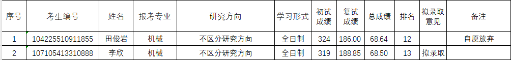 机械专业硕士研究生(全日制)第一次调剂名额为12个,对参加第一次调剂复试的考生,按照总成绩排名进行拟录取。现由于第12名考生自愿放弃拟录取资格,经新葡京娱乐城App