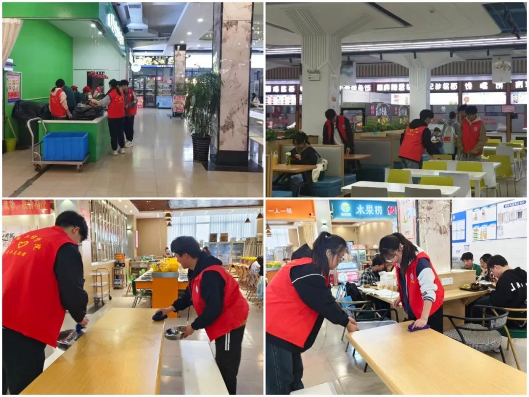 组织志愿者们在桃李餐厅进行为期一周的“勤俭养德”餐厅志愿服务。