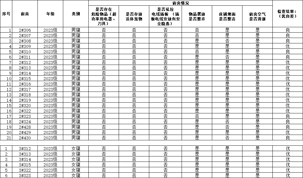 新葡京娱乐城App 研究生会生活部对23级宿舍卫生安全检查情况公示如下: