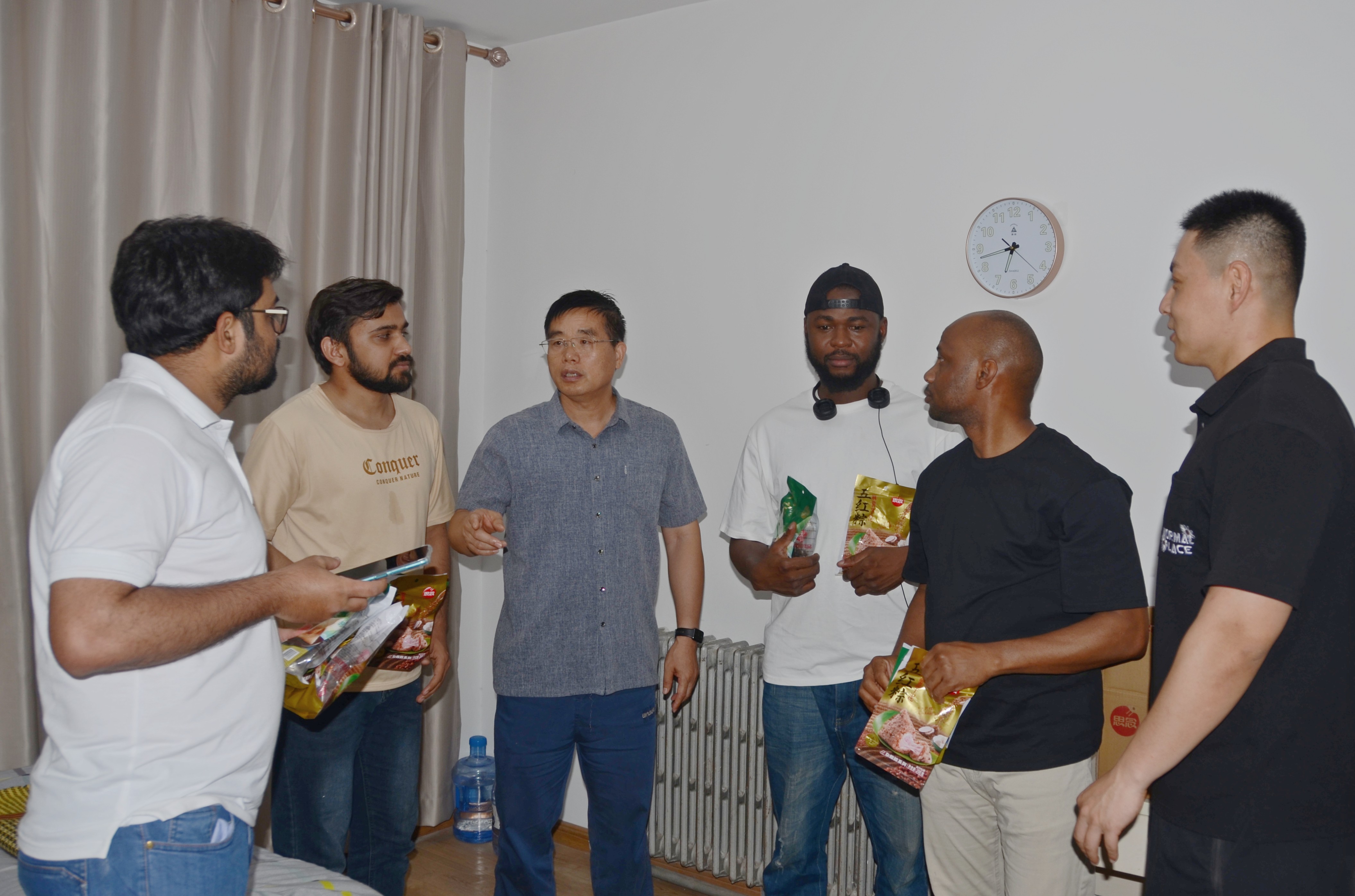 留学生学生宿舍,走访慰问留学生学习、生活状态,与留学生深入交流座谈。胡建东为留学生解读中国特色社会主义宗教理论与政策和中国端午节传统文化,希望留学生在刻苦学习的同时,能更多地了解中国优秀文化,成为中外交流的桥梁、文化的使者,为促进中国文化传播做出贡献。同时,对留学生宿舍安全提出要求,要求留学生严格要求自己,遵守新葡京娱乐城App