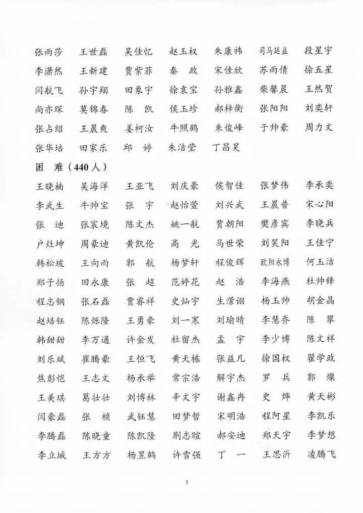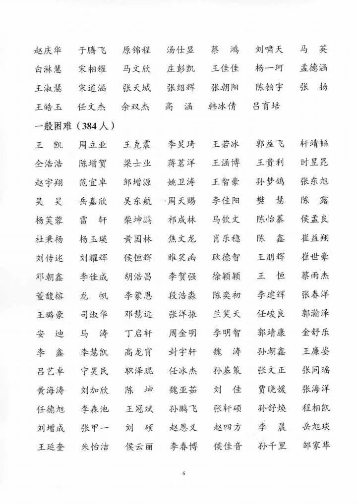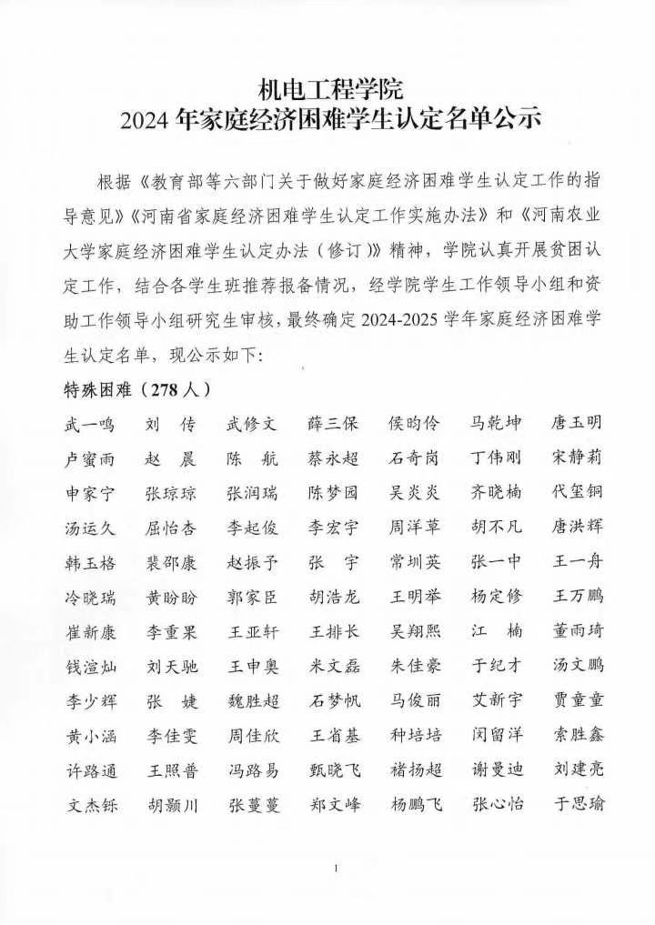 根据《教育部等六部门关于做好家庭经济困难学生认定工作的指导意见》《河南省家庭经济因难学生认定工作实施办法》和《新葡京娱乐城App 家庭经济困难学生认定办法(修订)》精神,新葡京娱乐城App 认真开展贫困认定工作,结合各学生班推荐报备情况,经新葡京娱乐城App 学生工作领导小组和资助工作领导小组研究生审核,最终确定2024-2025 学年家庭经济困难学生认定名单,现公示如下: