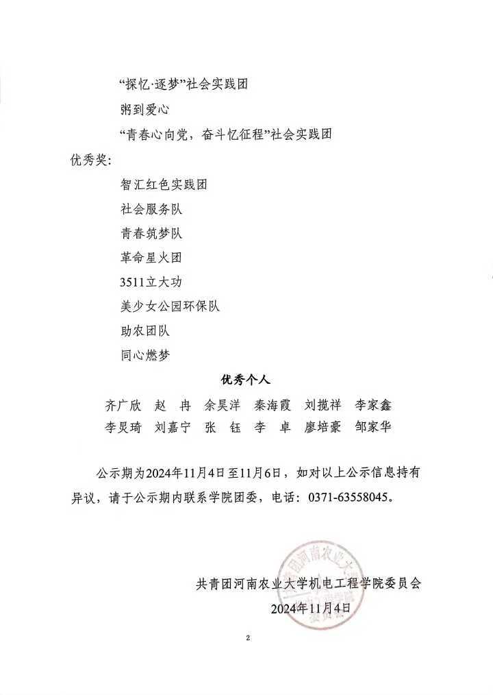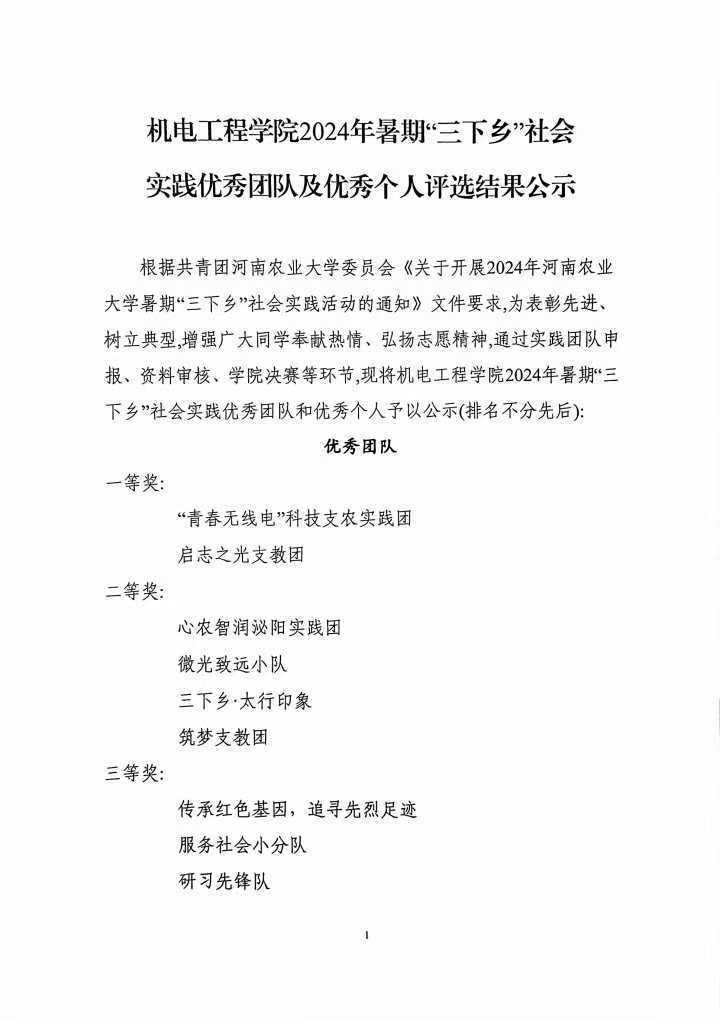 根据共青团新葡京娱乐城App 委员会《关于开展2024年新葡京娱乐城App 暑期“三下乡”社会实践活动的通知》文件要求,为表彰先进、树立典型,增强广大同学奉献热情、弘扬志愿精神,通过实践团队申报、资料审核、新葡京娱乐城App 决赛等环节,现将新葡京娱乐城App 2024年暑期“三下乡”社会实践优秀团队和优秀个人予以公示(排名不分先后):