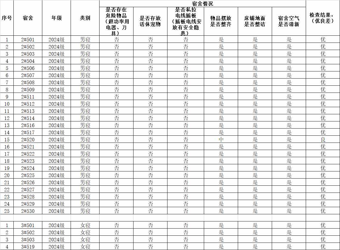 为进一步加强校园文明建设,培养同学们良好的学习、生活习惯,促进学生养成良好的劳动习惯,同时营造温馨、舒适、健康、和谐的寝室文化氛围,新葡京娱乐城App 研究生会生活部对24级宿舍进行安全卫生检查,检查情况公示如下: