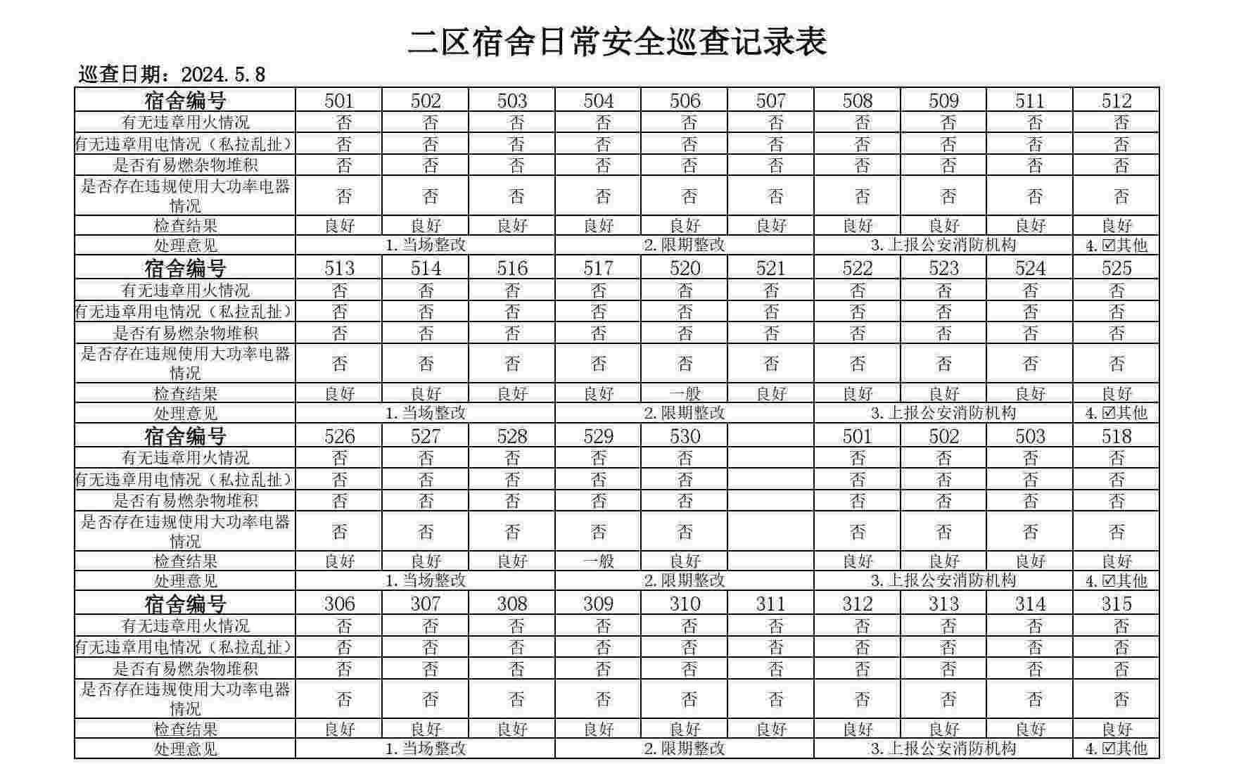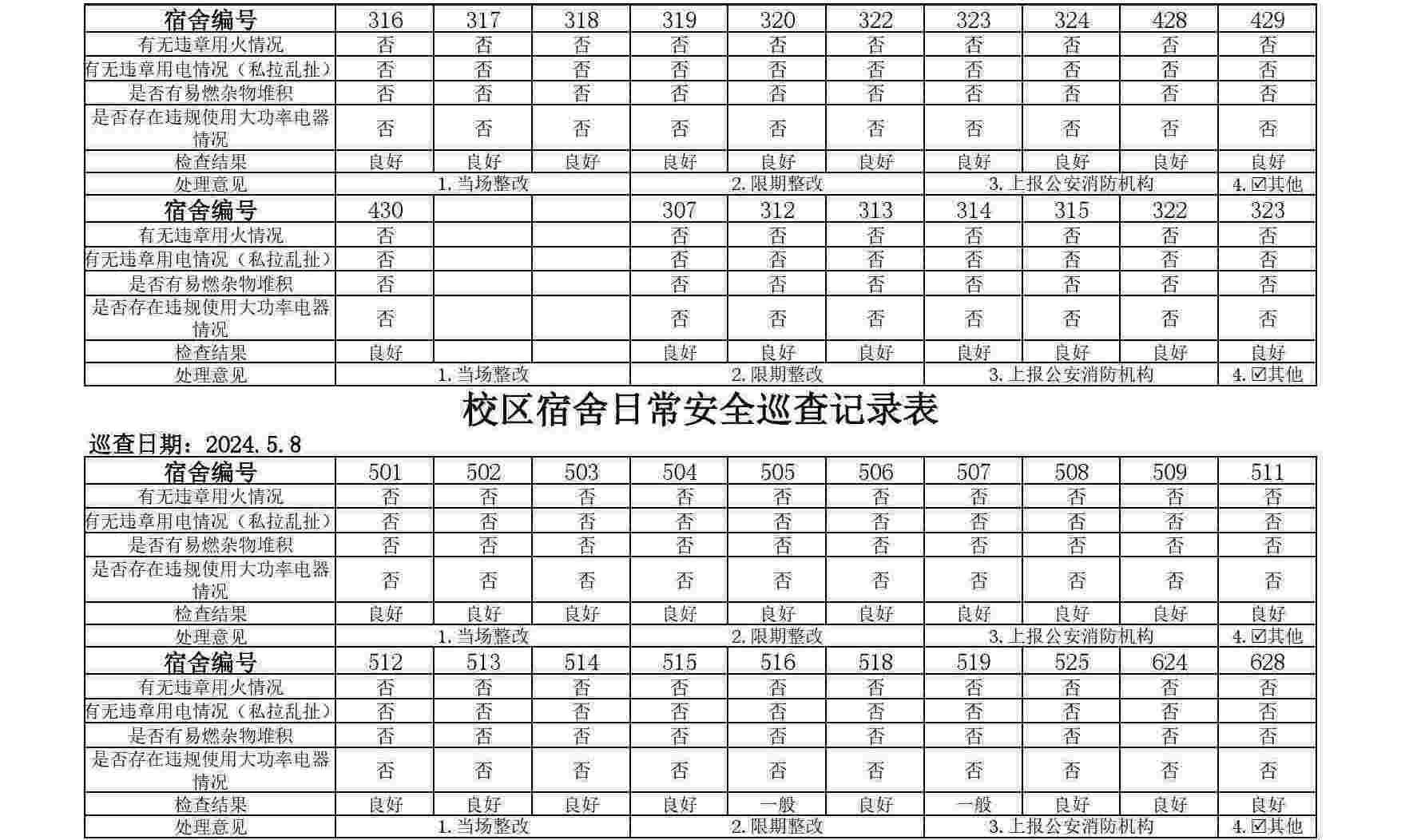 于2025年5月8日晚组织开展了学生宿舍安全卫生检查工作。本次检查覆盖二区及校区的研究生全体宿舍,采用全面检查的方式,对宿舍安全、用电安全、宿舍卫生及公共区域环境等方面进行综合评估。现将检查情况总结如下: