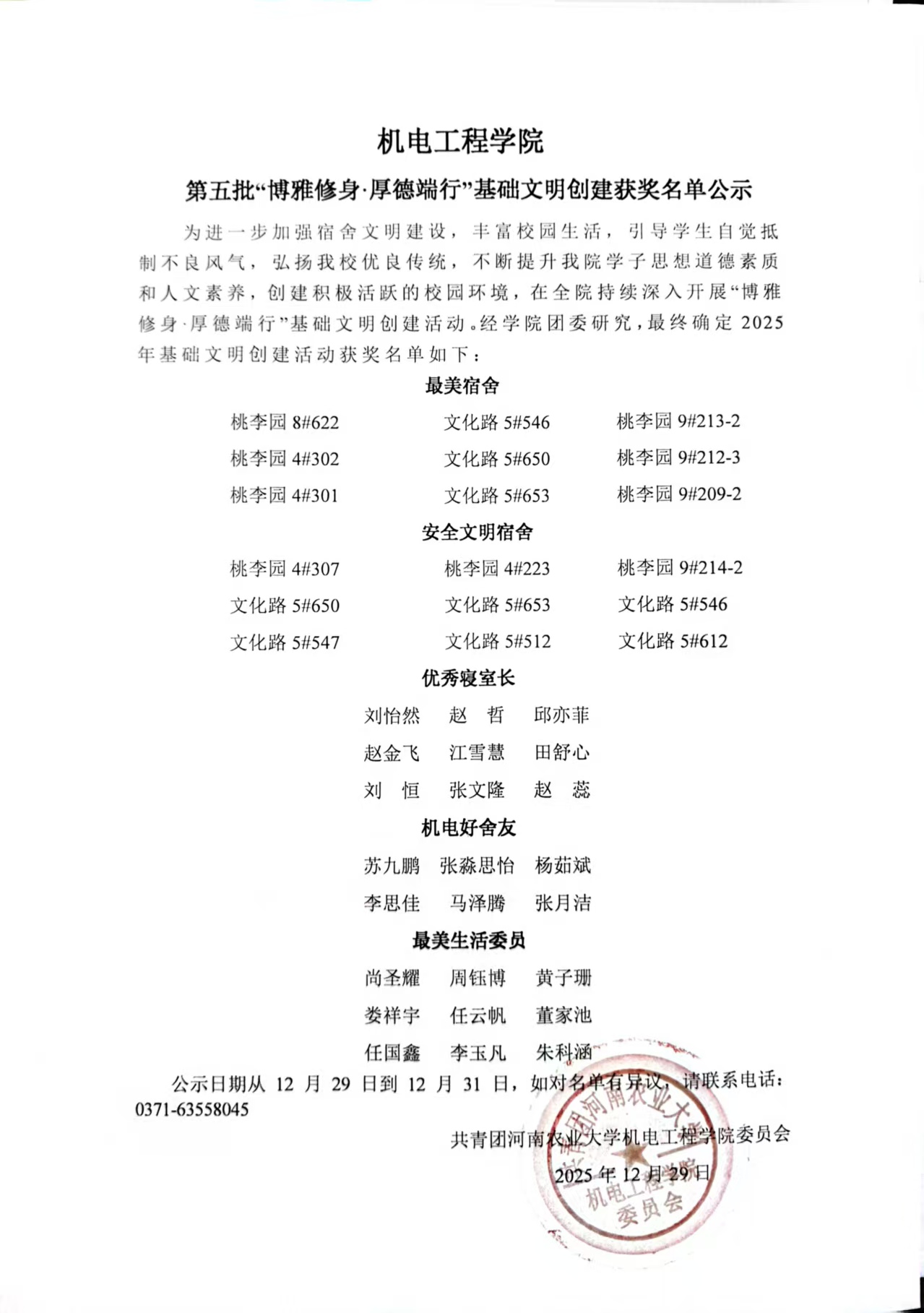 为切实加强宿舍文明建设、丰富校园文化生活,引导青年学生摒弃不良风气、传承新葡京娱乐城App 优良传统,全面提升学子思想道德素质与人文修养,打造积极健康的育人环境,新葡京娱乐城App 深入推进 “博雅修身・厚德端行” 基础文明创建活动。经新葡京娱乐城App 团委研究,2025 年该活动获奖名单确定如下: