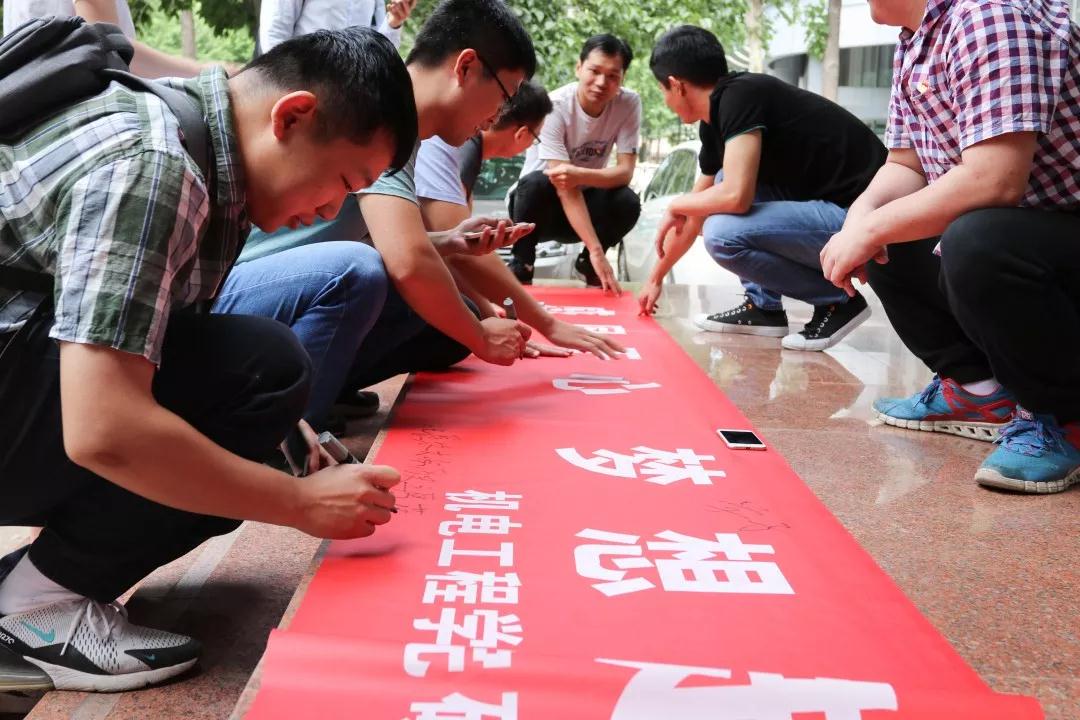 楼前,在“感恩于心,梦想起航”的横幅上写下了赠言并署名,表达对母校的不舍与祝福。