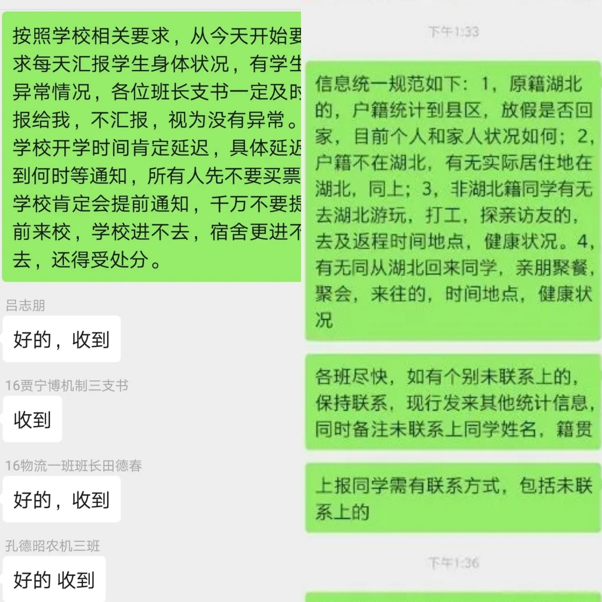 以学生平安健康为疫情防控工作重点,实行防疫信息“日报送”制度,各年级辅导员通过网络平台,按照每日报备、实时更新、建立台账、后续追踪的“全过程”管理模式,对学生情况进行准确摸排,将数据定点到人。每日远程采集学生近况,特别是个人和家人身体健康状况,做到全覆盖、无遗漏,确保疫情排查到位及开学准备工作顺利开展。