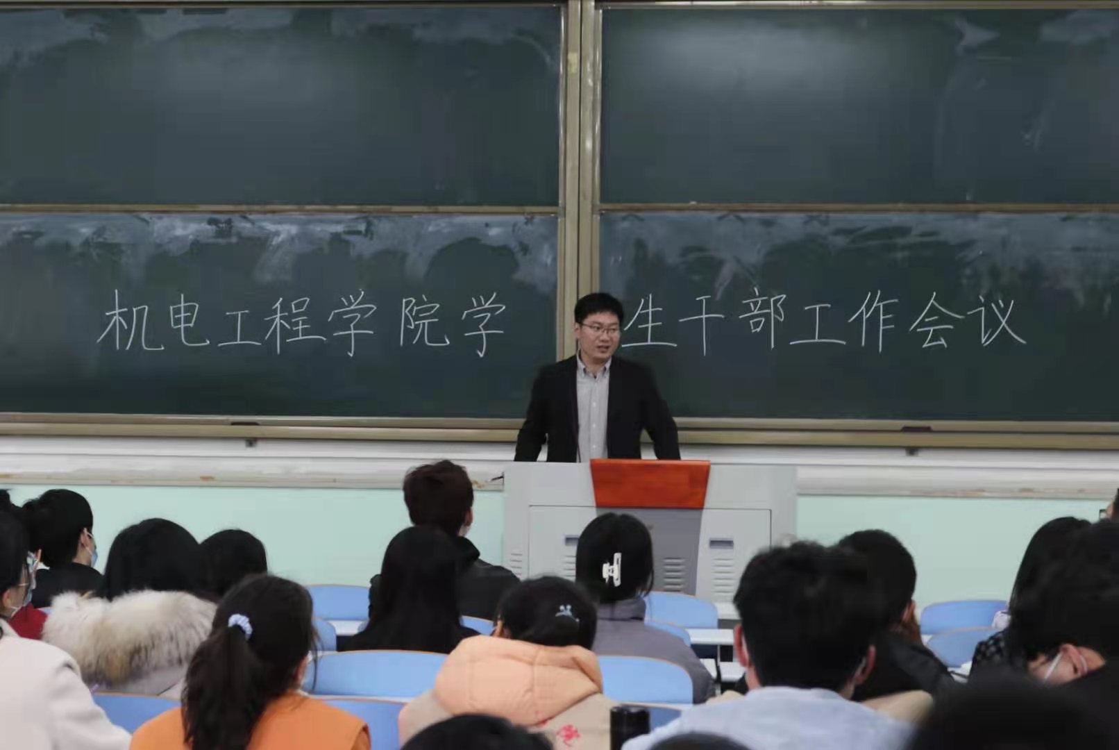 于文化路校区工程楼101教室召开全体学生干部工作会议,院团委书记黄笑、团委副书记徐捧丽、各年级班长支书、团委、学生会、红色火炬工作室等全院主要学生干部参加了会议。