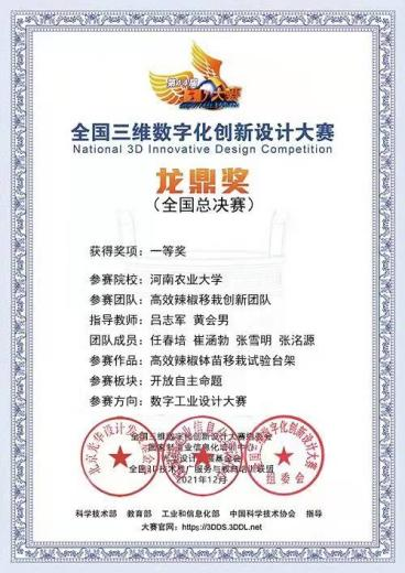 吕志军、黄会男老师指导的“高效辣椒移栽创新团队”(本科生队员:任春培、崔涵勃、张雪明、张洺源)凭借作品《高效辣椒钵苗移栽试验台架》取得大赛(数字工业方向)一等奖,由新葡京娱乐城App