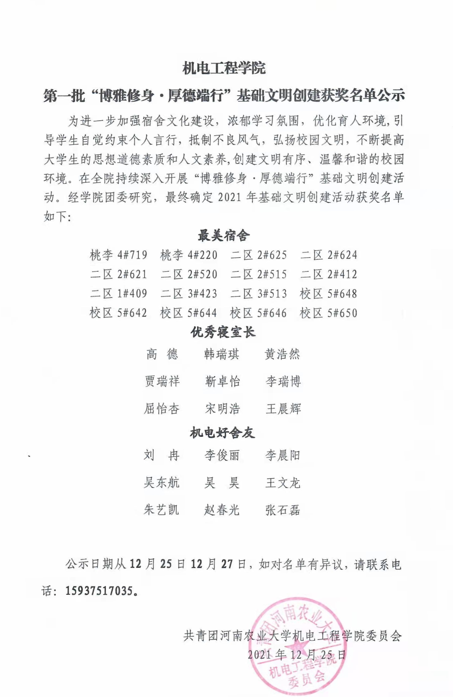 为进一步加强宿舍文化建设,浓郁学习氛围,优化育人环境,引导学生自觉约束个人言行,抵制不良风气,弘扬校园文明,不断提高大学生的思想道德素质和人文素养,创建文明有序、温馨和谐的校园环境。在全院持续深入开展“博雅修身·厚德端行”基础文明创建活动。经新葡京娱乐城App 团委研究,最终确定2021年基础文明创建活动获奖名单如下: