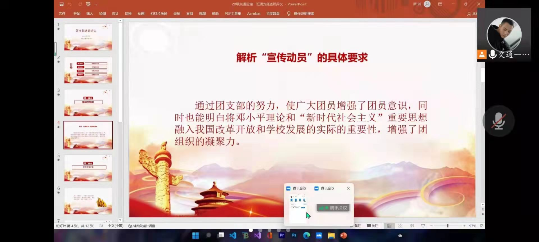 68个团支部结合实际情况采取现场述职和书面述职、线上和线下相结合的方式进行述职汇报。各团支部书记分别就团支部建设、团员管理、团日活动开展、班级智慧团建录入完善等方面展开阐述,详细介绍各项日常工作,并通过总结过去一年来工作中的成绩与不足,做出2023年的工作展望。述职评议考核过程中,院团委秉持公正公开原则,严格按照考核工作要求,实施全过程监督。
