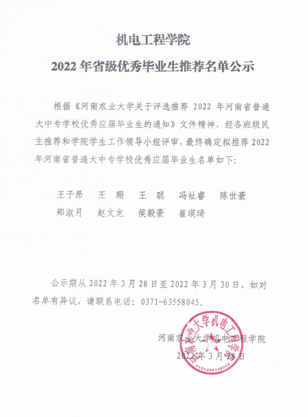 根据《新葡京娱乐城App 关于评选推荐2022年河南省普通大中专新葡京娱乐城App 优秀应届毕业生的通知》文件精神,经各班级民主推荐和新葡京娱乐城App 学生工作领导小组评审,最终确定拟推荐2022年河南省普通大中专新葡京娱乐城App 优秀应届毕业生名单如下: