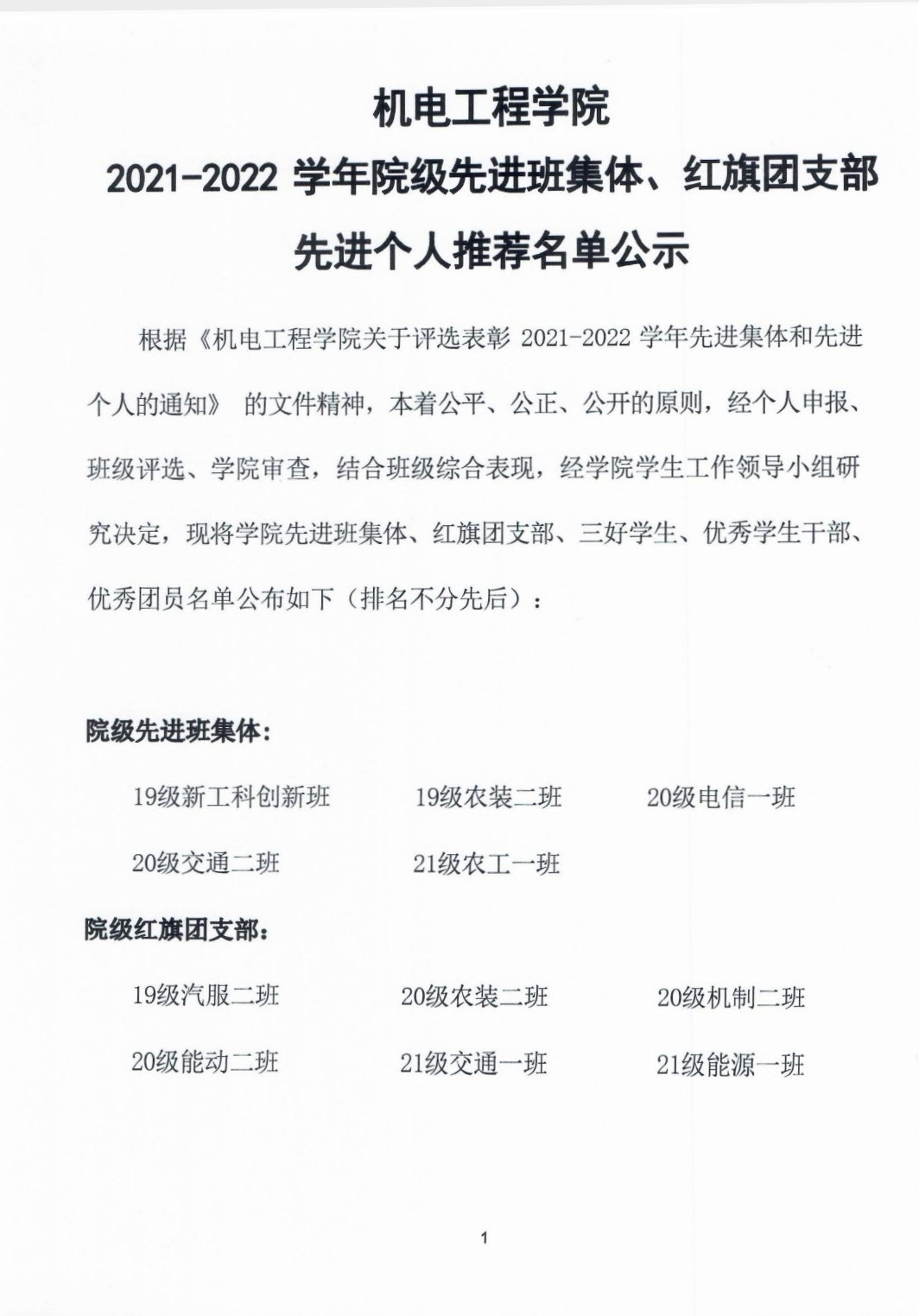 新葡京娱乐城App 2021-2022学年院级先进班集体、红旗团支部、先进个人推荐名单公示