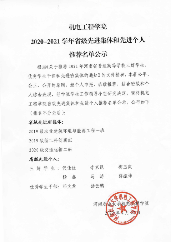 根据《关于推荐2021年河南省普通高等新葡京娱乐城App 三好学生、优秀学生干部和先进班集体的通知》的文件精神,本着公平、公正、公开的原则,经个人申报、班级推荐,结合班级和个人综合表现,经新葡京娱乐城App 学生工作领导小组研究决定,现将新葡京娱乐城App 省级先进集体和先进个人推荐名单公示,公布如下(排序不分先后):