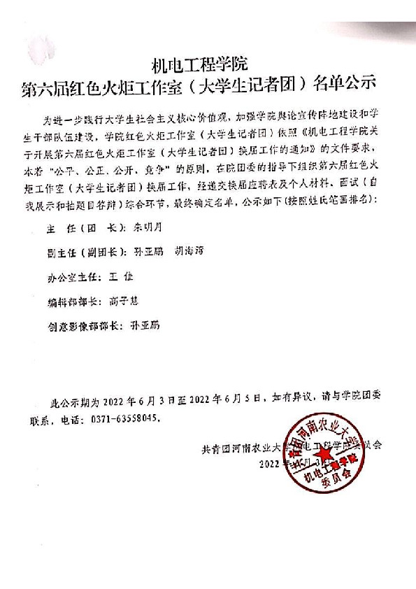关于开展第六届红色火炬工作室(大学生记者团)换届工作的通知》的文件要求,本着“公平、公正、公开、竞争”的原则,在院团委的指导下组织第六届红色火炬工作室(大学生记者团)换届工作,经递交换届应聘表及个人材料、面试(自我展示和抽题目答辩)综合环节,最终确定名单,公示如下(按照姓氏笔画排序):