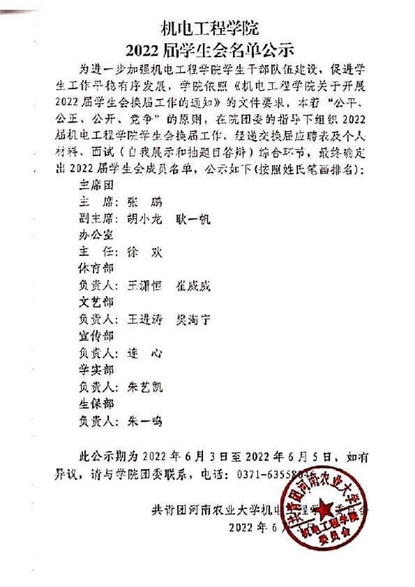 学生会换届工作,经递交换届应聘表及个人材料、面试(自我展示和抽题目答辩)综合环节,最终确定出2022届学生会成员名单,公示如下(按照姓氏笔画排名):