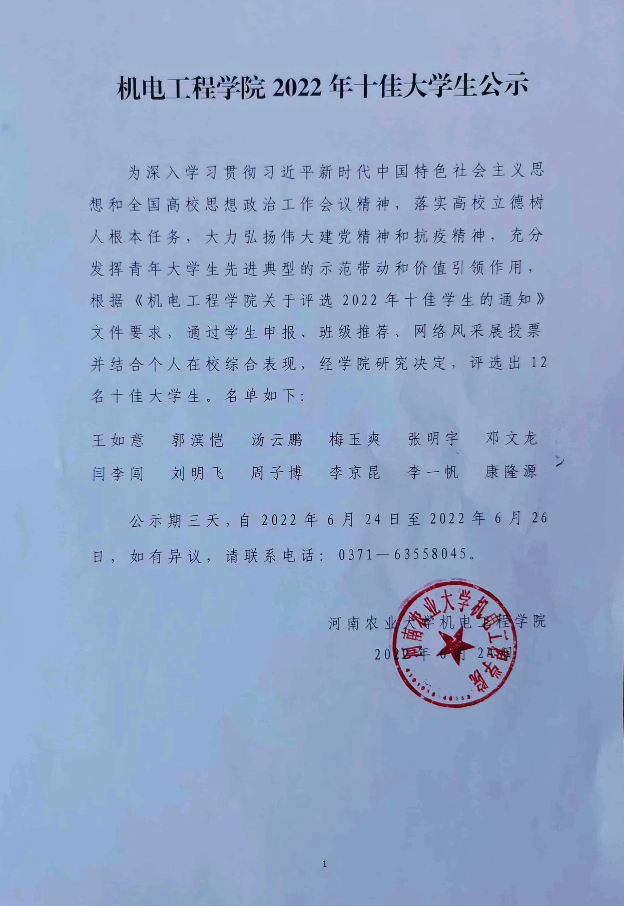 为深入学习贯彻习近平新时代中国特色社会主义思想和全国高校思想政治工作会议精神,落实高校立德树人根本任务,大力弘扬伟大建党精神和抗疫精神,充分发挥青年大学生先进典型的示范带动和价值引领作用,根据《新葡京娱乐城App 关于评选2022年十佳学生的通知》文件要求,通过学生申报、班级推荐、网络风采展投票并结合个人在校综合表现,经新葡京娱乐城App 研究决定,评选出12名十佳大学生。名单如下: