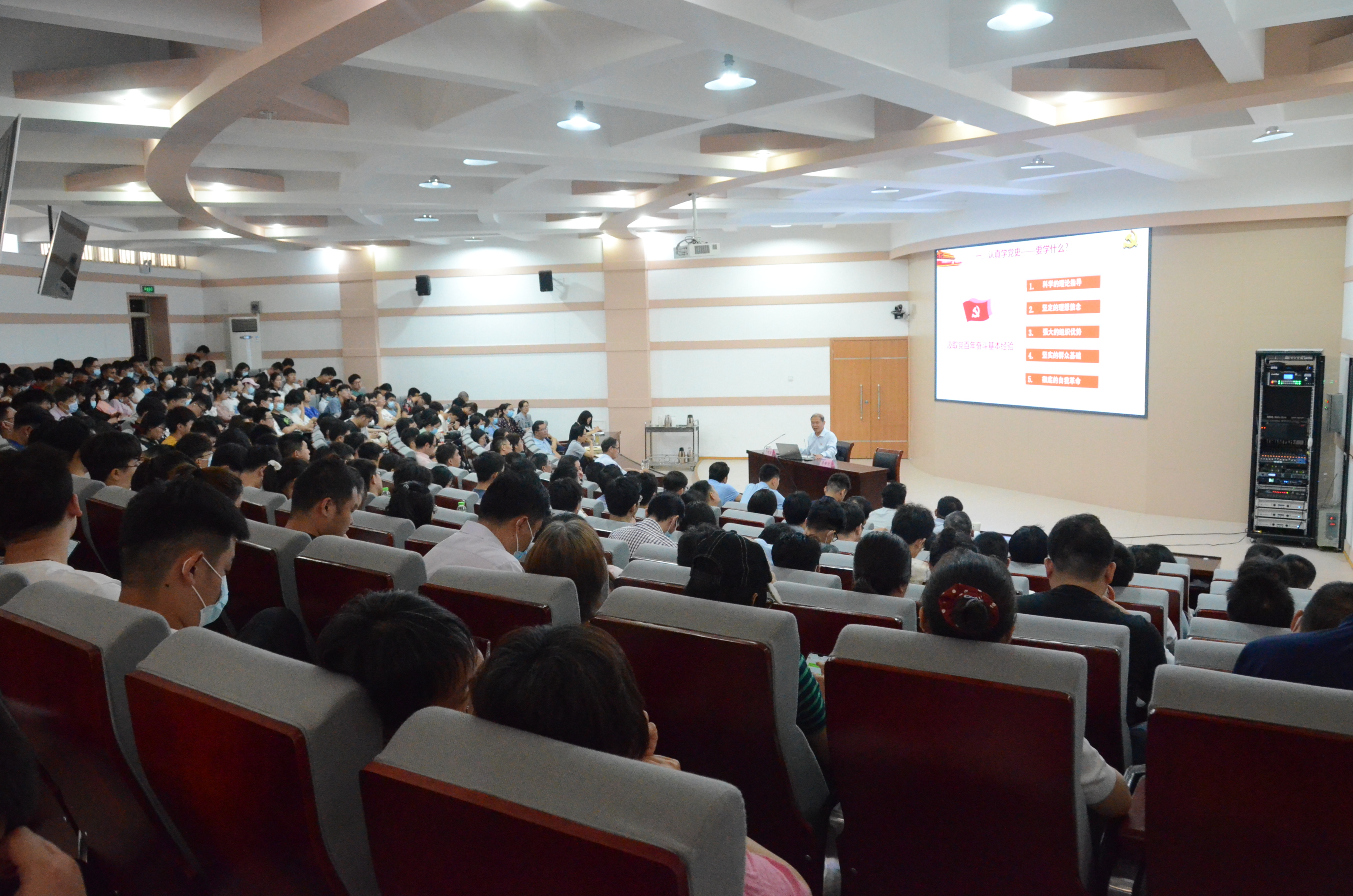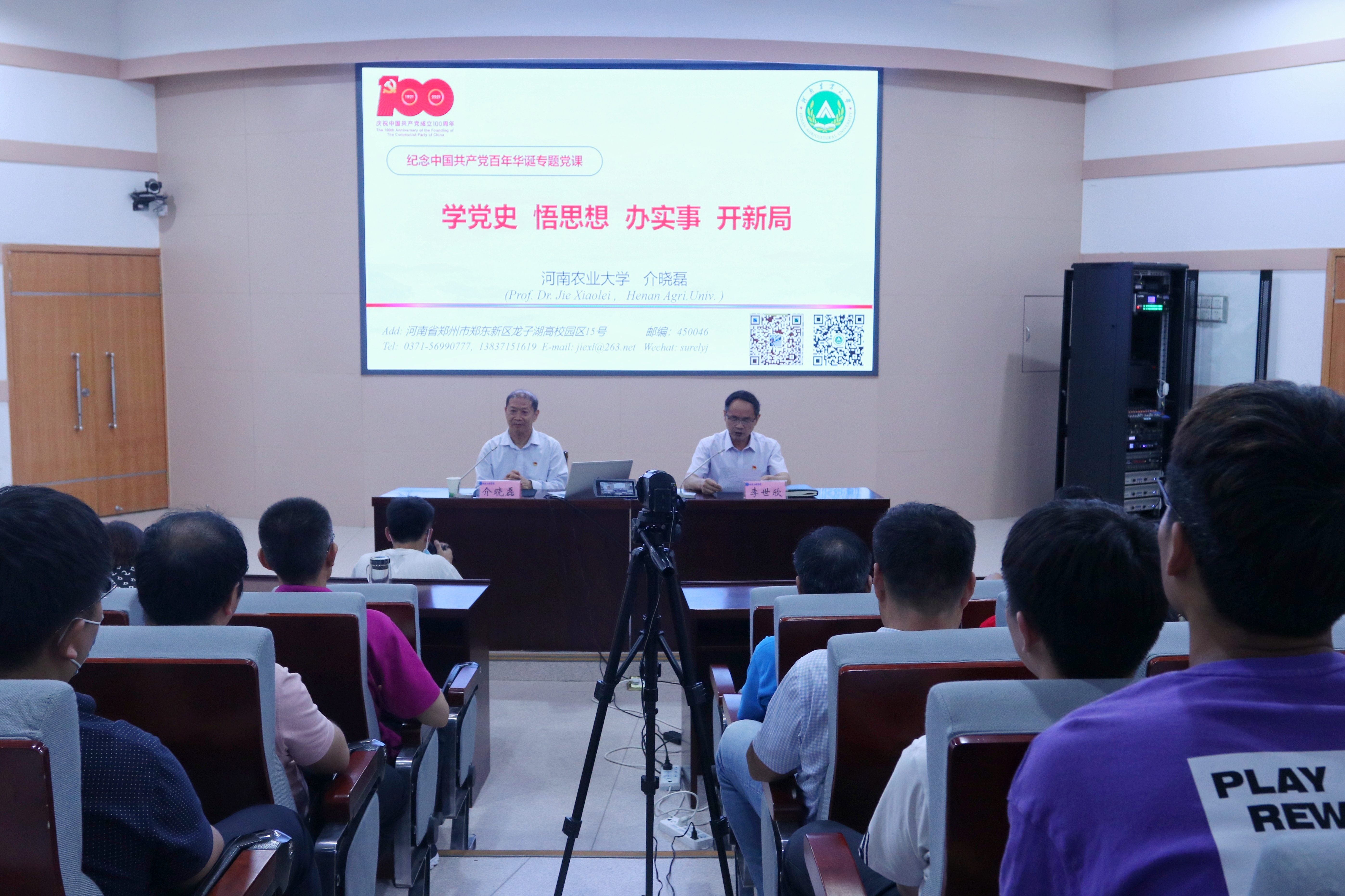 介晓磊围绕“认真学党史”、“深刻悟思想”、“扎实办实事”和“着力开新局”四个篇章,多角度、深层次地同大家进行交流。接着,他分别展开详细论述,以“为什么学”、“要学什么”、“要怎么学”解答了学党史的深刻内涵,并向与会人员提出三要,一是要树立正确党史观,二是要实事求是的看待党史上的重大问题,三是要旗帜鲜明的反对历史虚无主义。于“感悟思想伟力”、“把握理论体系”、“领会创新理论”中阐述如何悟思想,他指出,广大党员干部要始终高举马克思主义旗帜,要学懂弄通做实习近平新时代中国特色社会主义思想,固本培元,补足精神之钙。由“做到知行合一”、“激发内生动力”、“坚持实践导向”说明如何办实事,他强调学史明理、学史增信、学史崇德、学史力行,希望青年学生立大志、明大德、成大才,成长为堪当民族复兴重任的时代新人。从“做好顶层设计”、“转变思想观念”、“坚决有效落实”中概括如何开新局,通过列举牧原公司的创办事迹,鼓励青年学生做好职业生涯规划,向有理想、有本领、有担当的新时代青年的行列看齐。