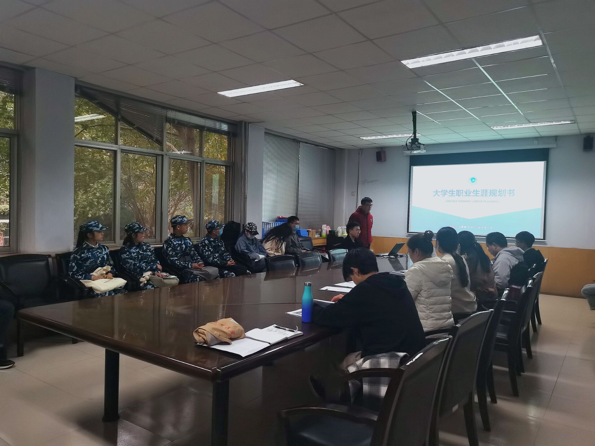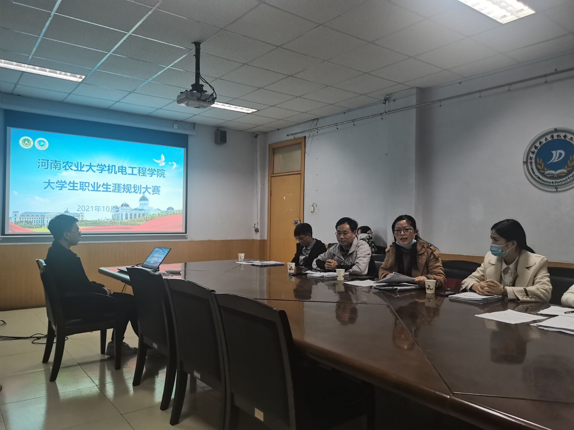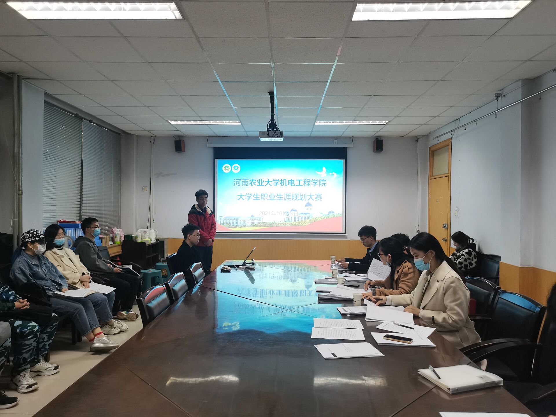 于院办二楼会议室举办2021年大学生职业生涯规划大赛决赛。院团委副书记徐捧丽,辅导员胡亭亭,老师李祥付、马晓然,19级学生郭滨恺担任此次比赛评委。